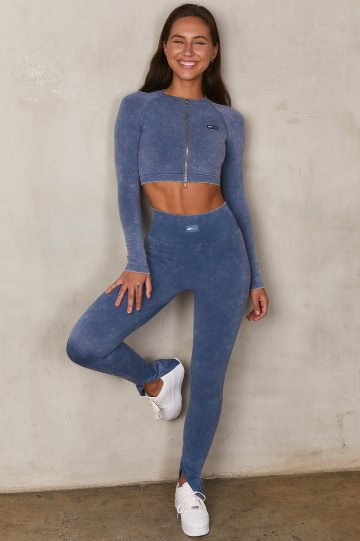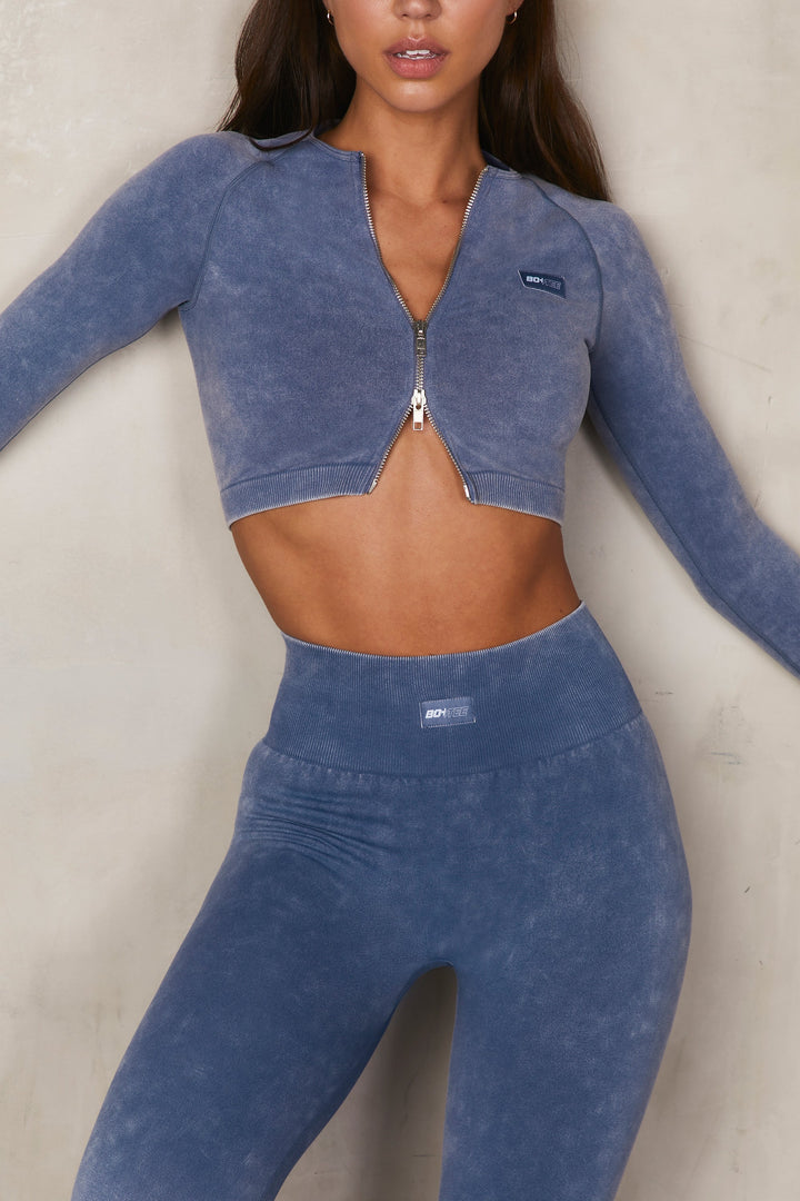 Dikişsiz Asit Yıkamalı Fermuarlı Crop Top, İndigo