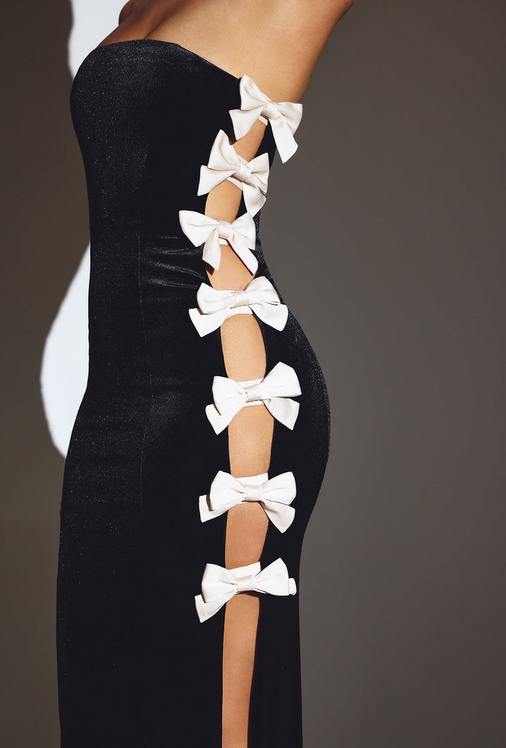 Simsiyah Kadife Fiyonk Detaylı Maxi Elbise