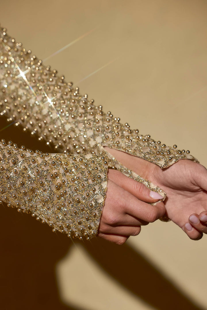 Altın Rengi Taşlı Kabarcık Etek Mini Elbise