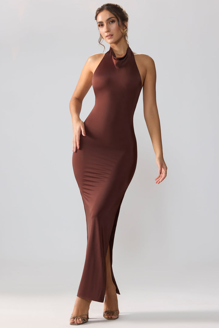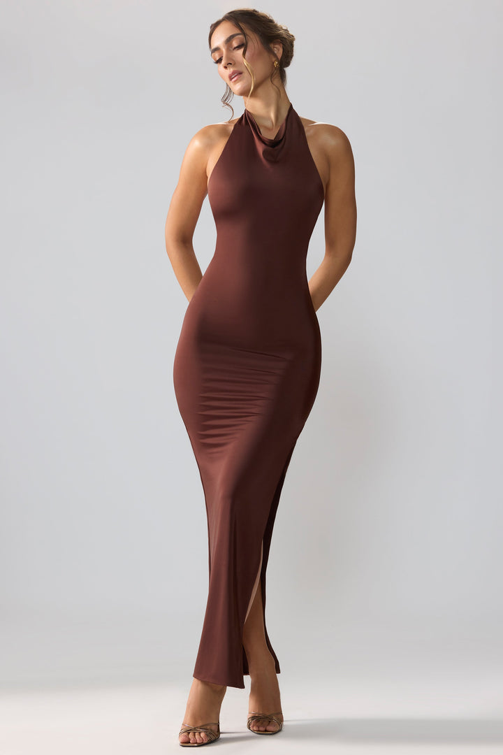 Premium Jersey Dekolte Yaka Sırtı Açık Espresso Maxi Elbise