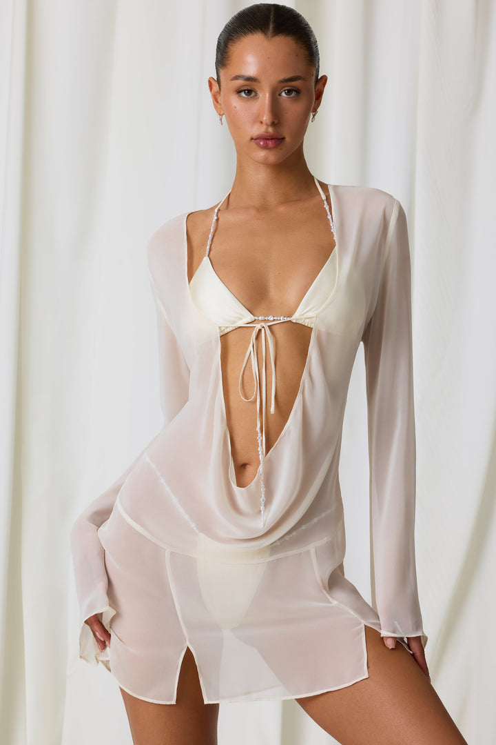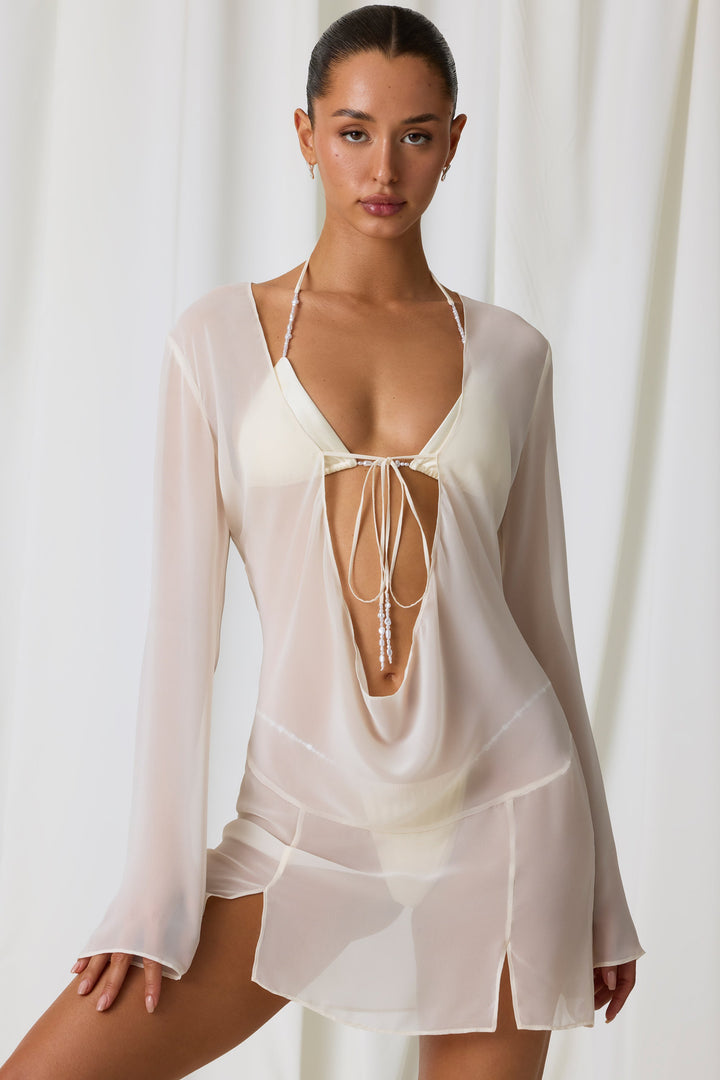 İnci Beyazı İnci Detaylı Dekolte Yaka Mikro Mini Elbise