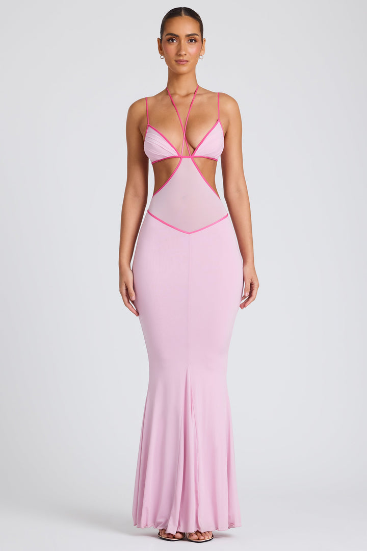 Soft Pembe Kontrast Bağlamalı Kesimli Gece Elbisesi
