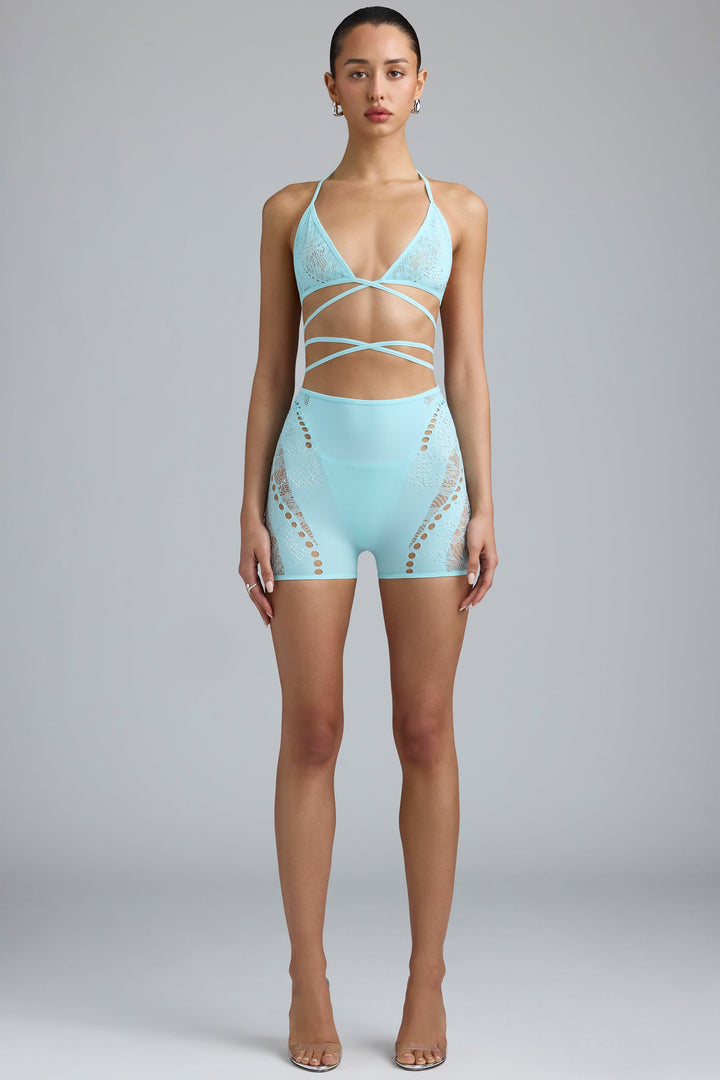 Buz Mavisi İşlemeli Yüksek Bel Şort