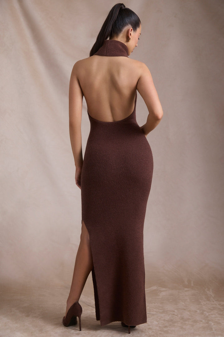 Espresso Desenli Balıkçı Yaka Sırtı Açık Uzun Elbise