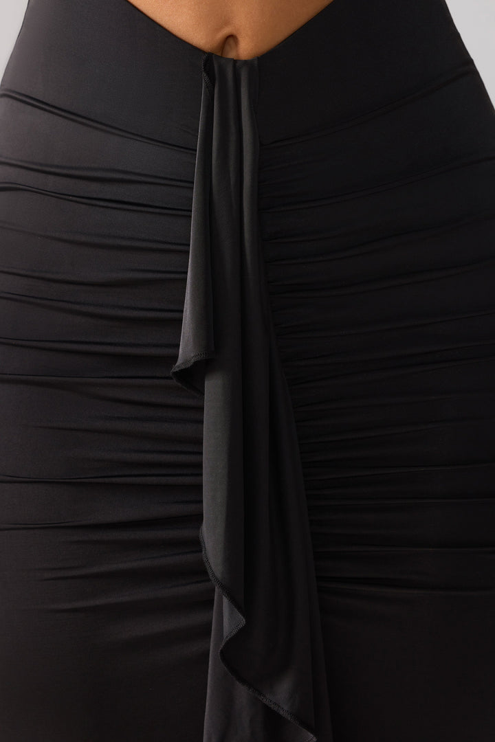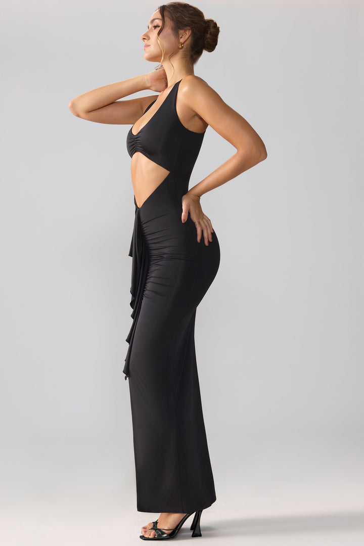 Siyah Slinky Jersey Kesik Fırfırlı Racerback Maxi Elbise