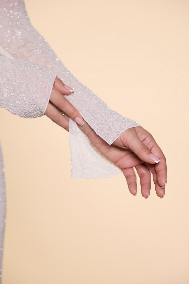 Fildişi Taşlı Dekolte Yaka Uzun Elbise