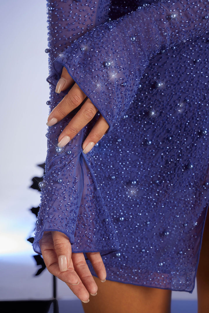 Koyu Mavi A Kesim Mini Elbise Üzeri İşlemeli