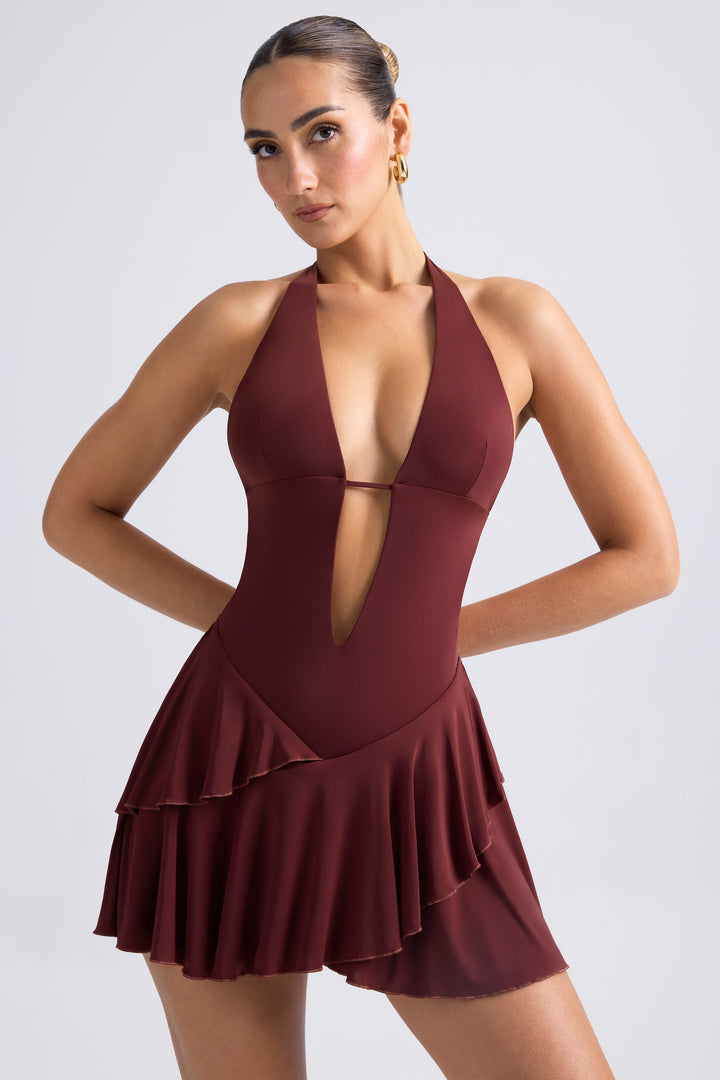Kestane Kahvesi Fırfırlı Kesik Boyundan Bağlı Mini Elbise