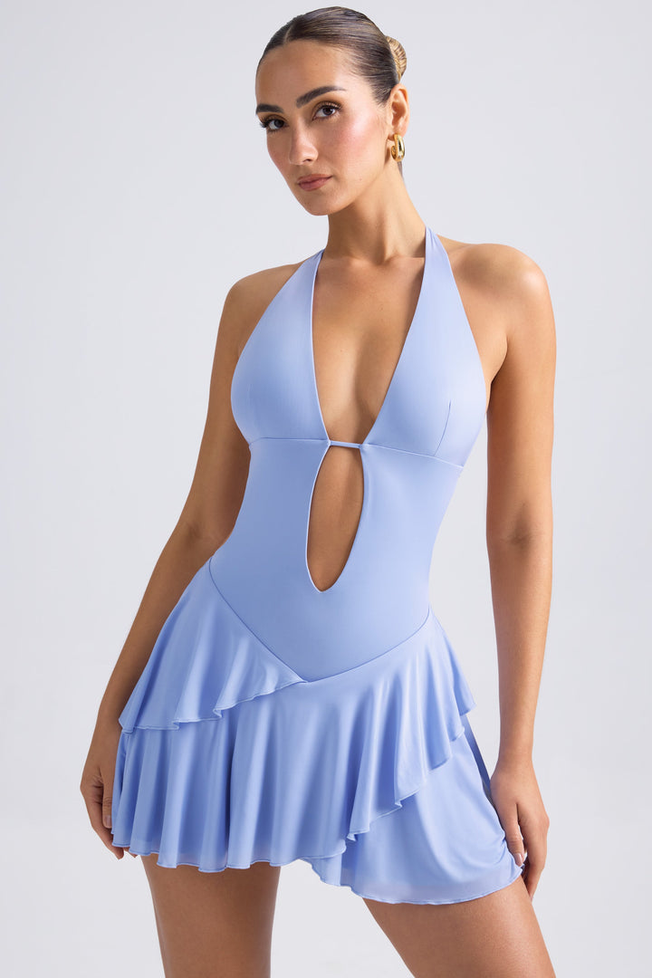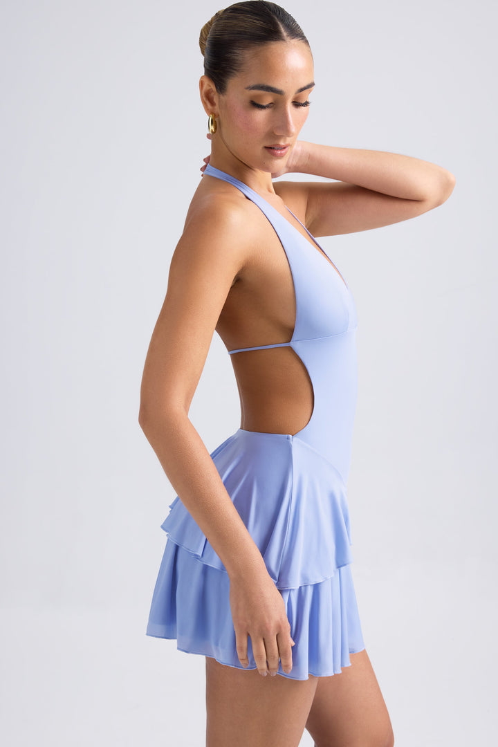 Cezayir Menekşesi Mavisi Fırfırlı Boyundan Bağlamalı Mini Elbise