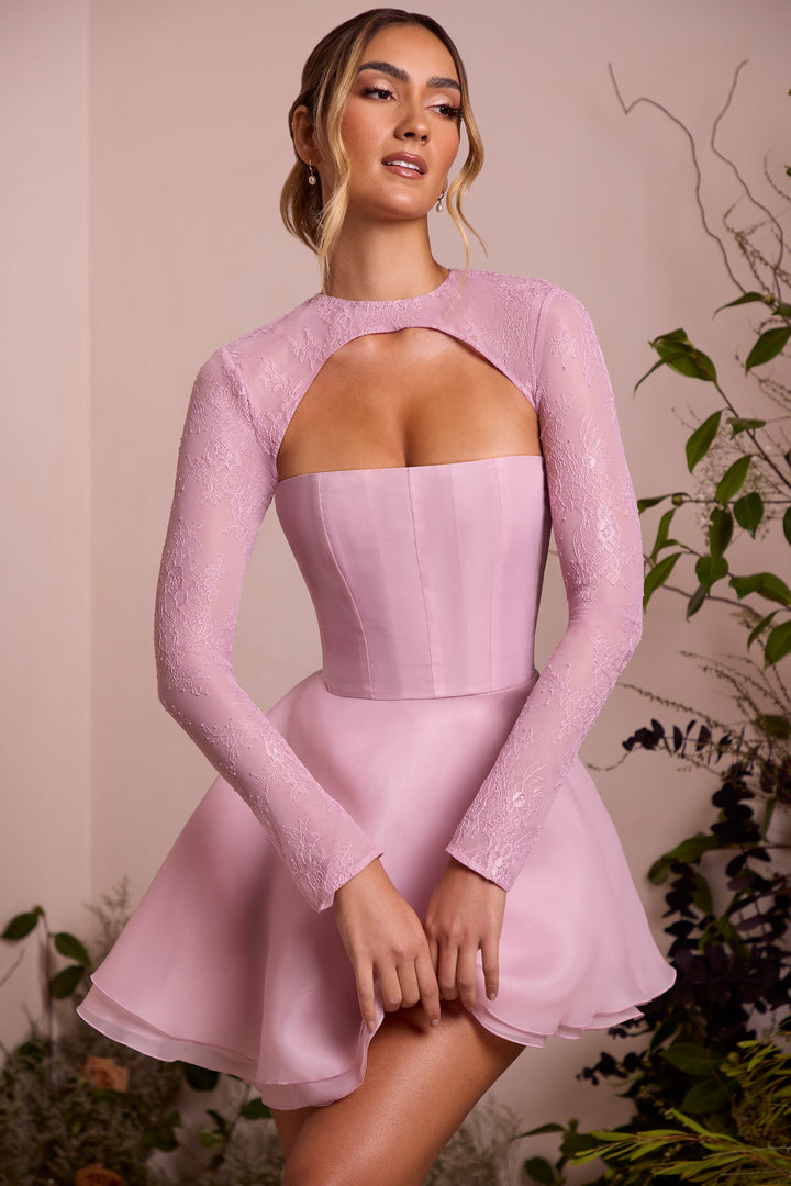 Toz Pembe Uzun Kollu Tül Etek Mini Elbise