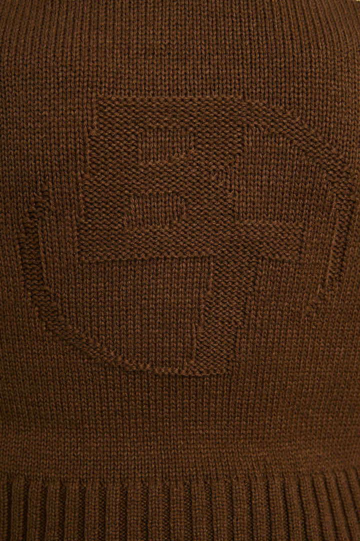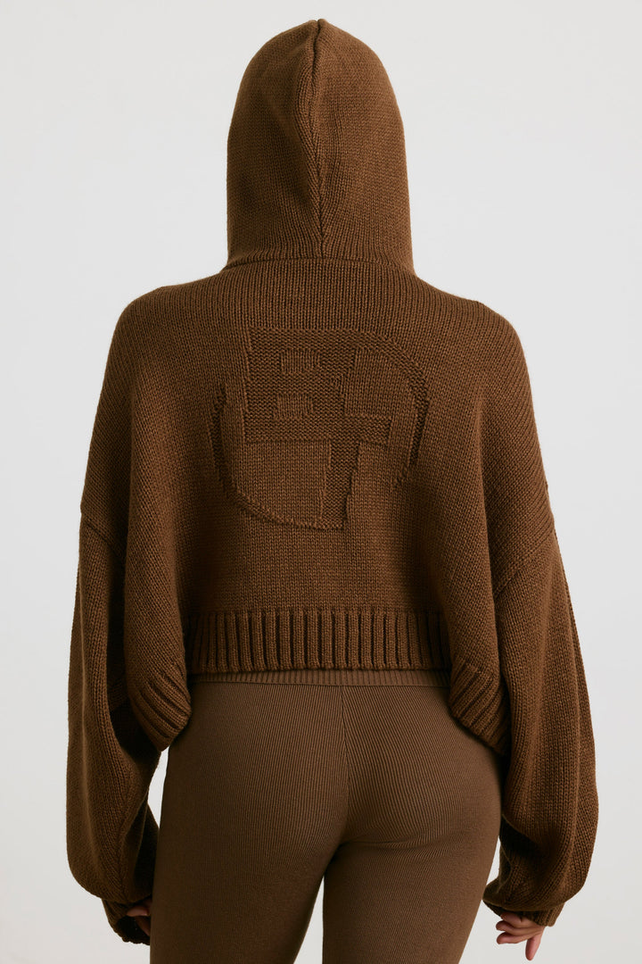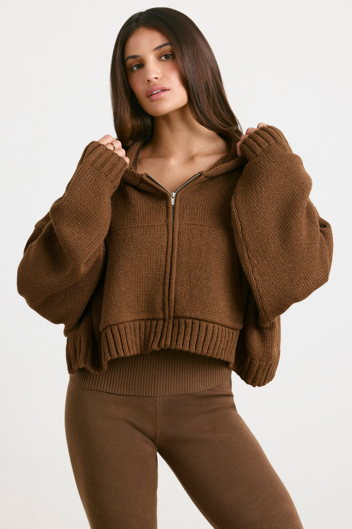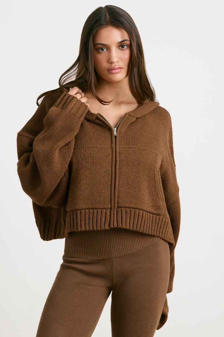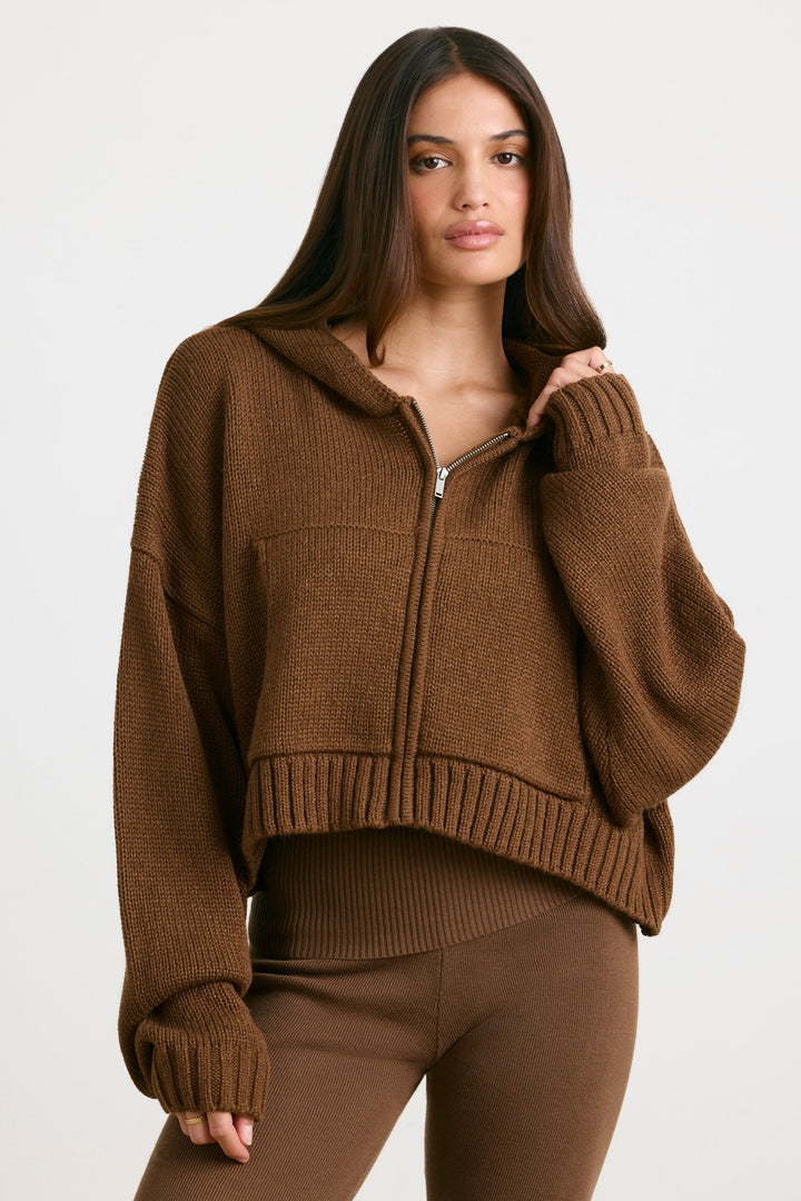 Espresso Kısa Fermuarlı Kalın Örgü Kapüşonlu Üst