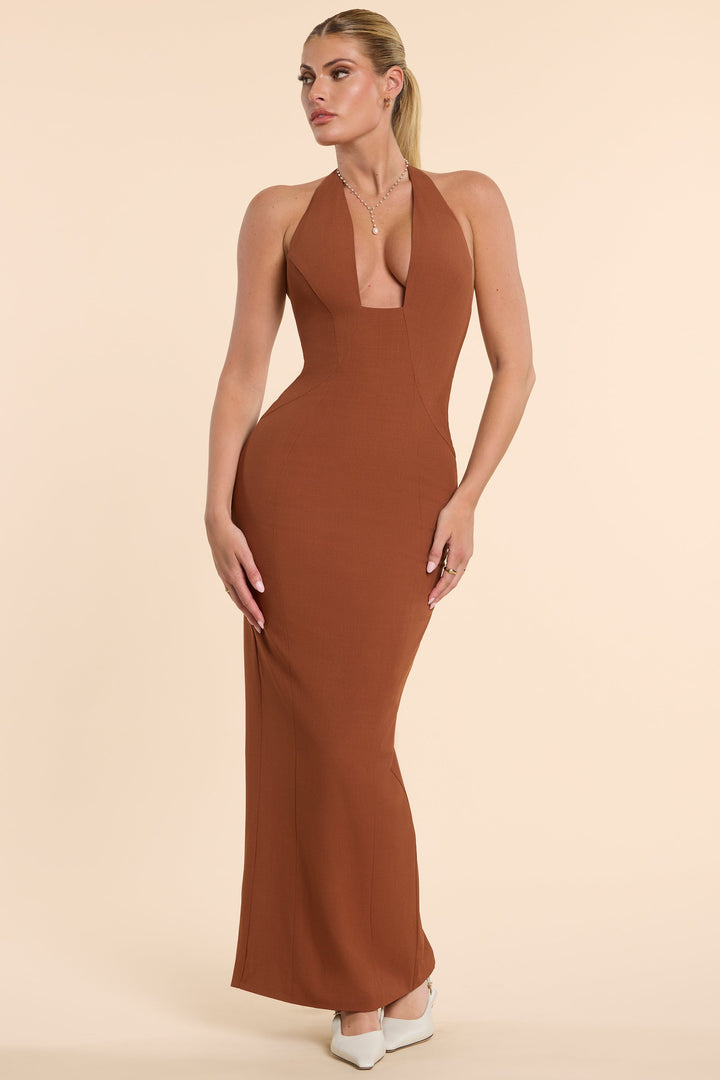 Kestane Kahverengi Dokuma Twill Boyundan Bağlamalı Dekolte Maxi Elbise