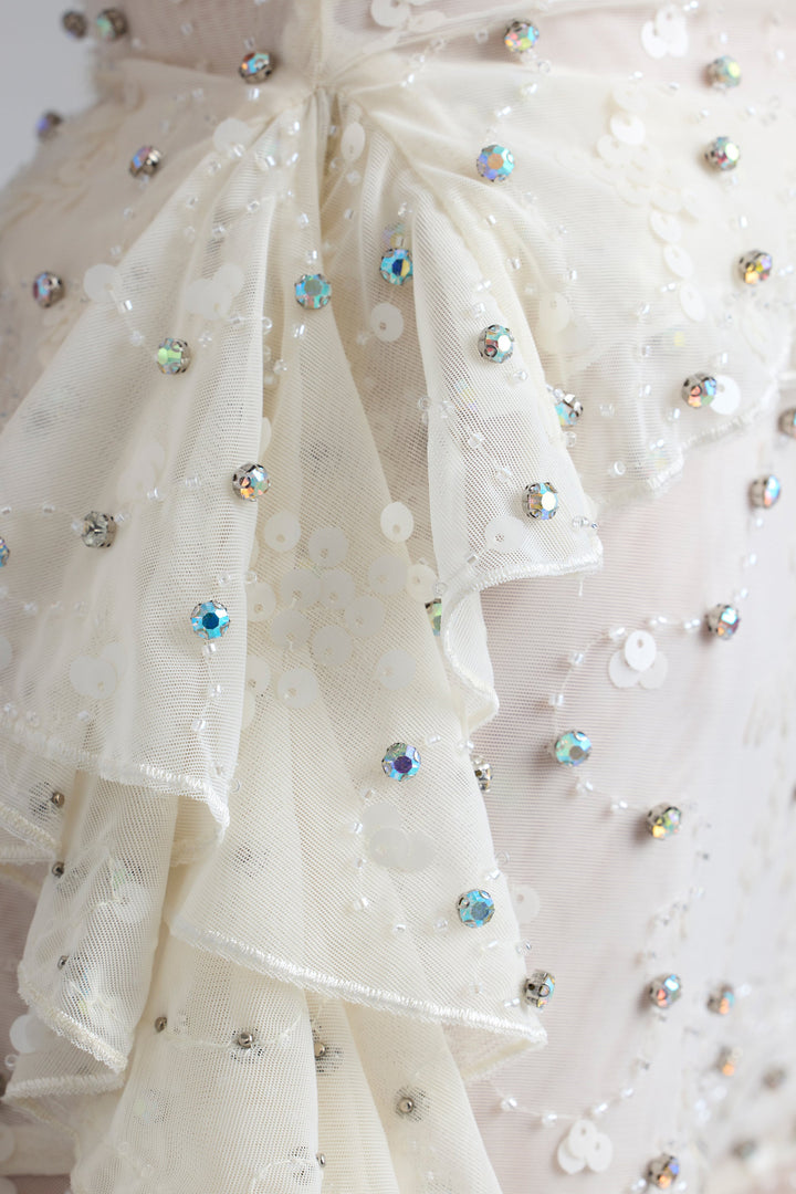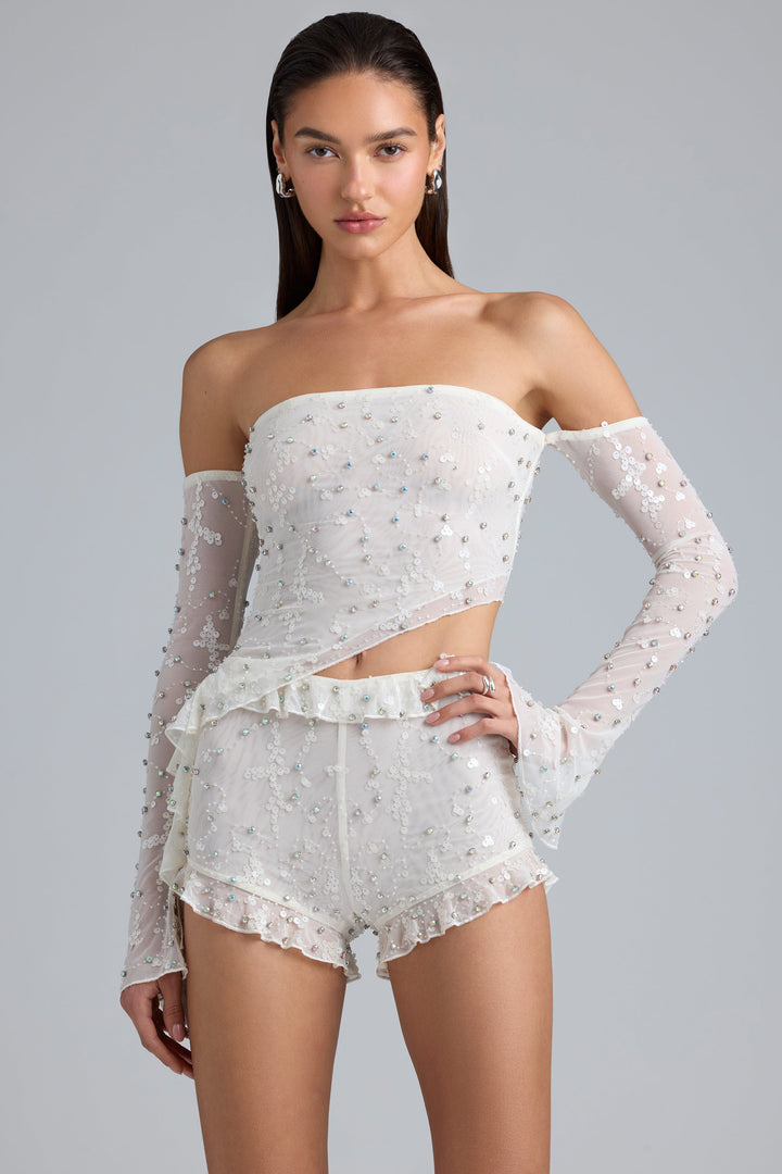Fildişi Dantelli Fırfırlı Asimetrik Üst