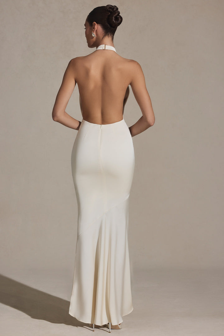 Fildişi Rengi Sırtı Açık Boyundan Bağlı Balık Kuyruğu Elbisesi