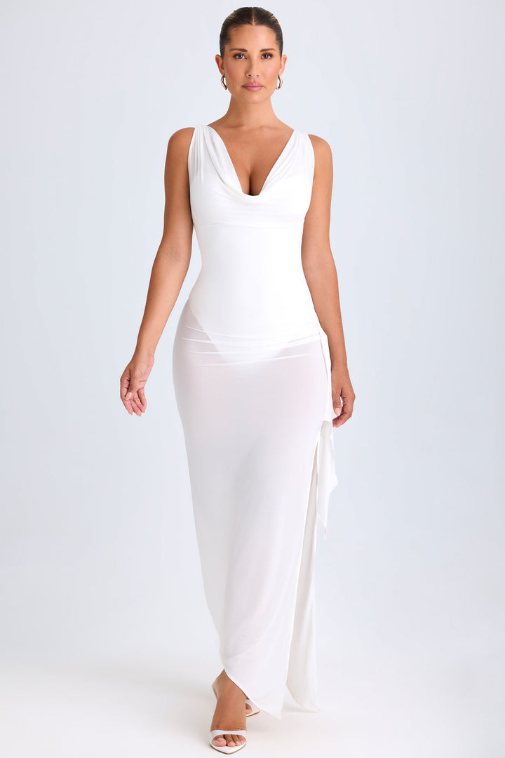 Beyaz Fırfırlı Dekolteli Midaksi Elbise