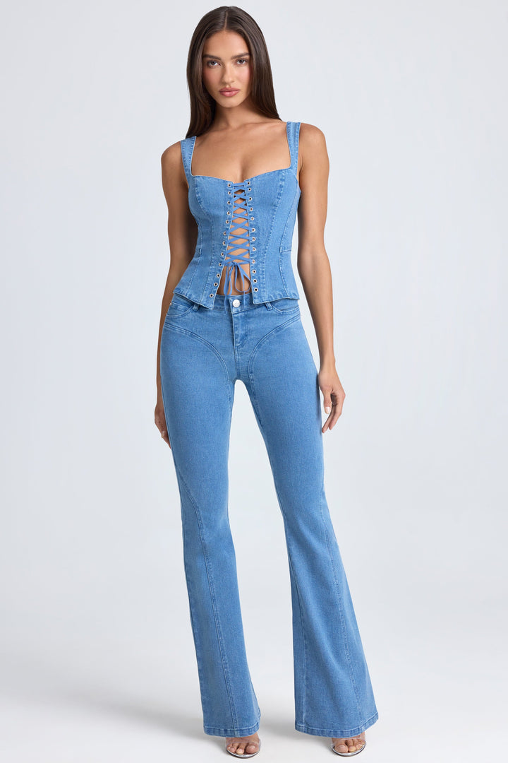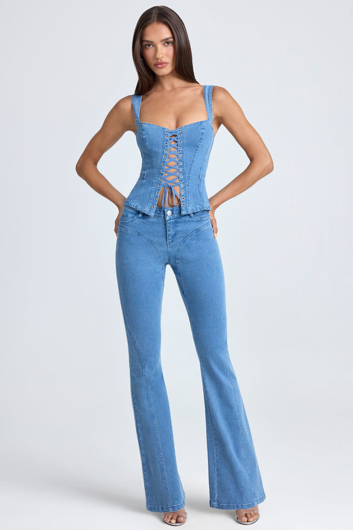 Orta Mavi Taş Yıkamalı Minyon Orta Bel Kloş Kot Pantolon