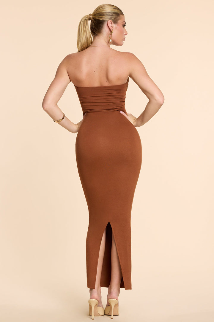 Kestane Kahvesi Straplez Dantelli Modal Kaşmir Karışımlı Maxi Elbise