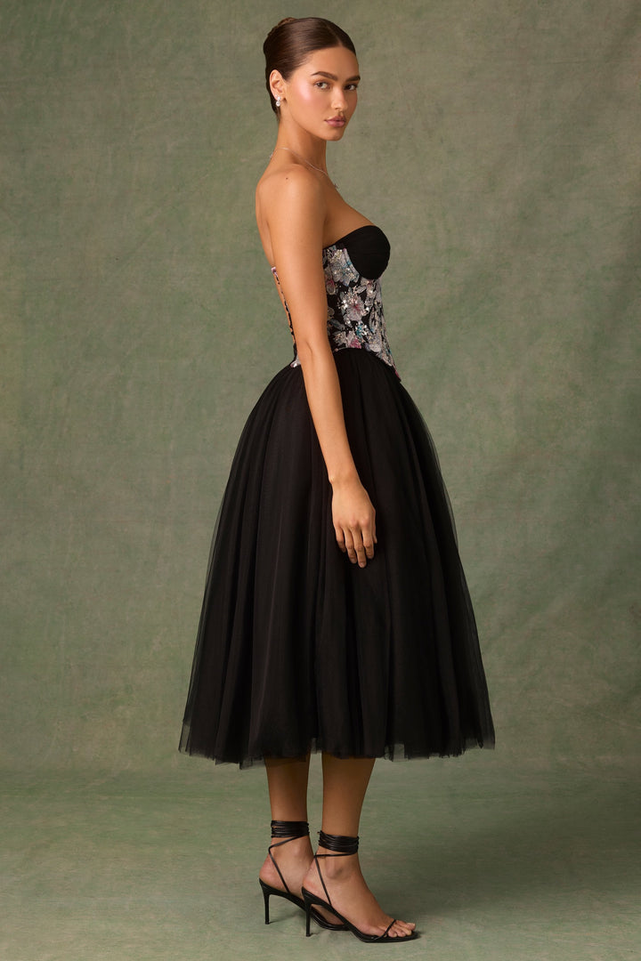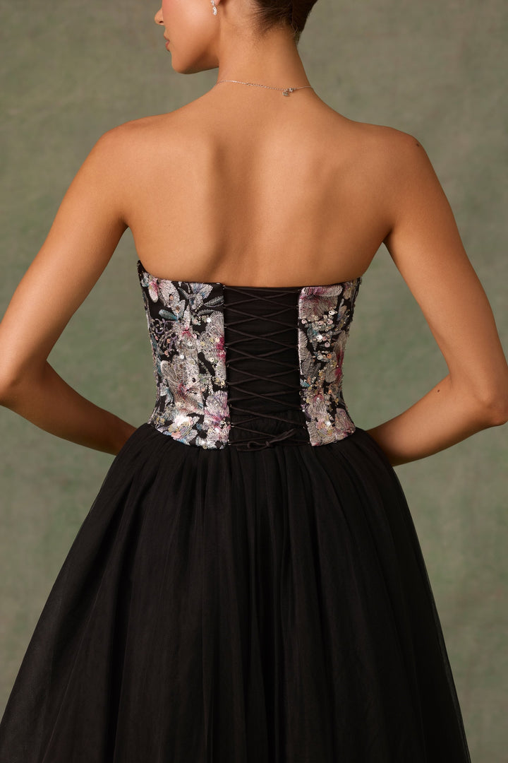 Siyah Çiçek Desenli Bağcıklı Cupless Korse