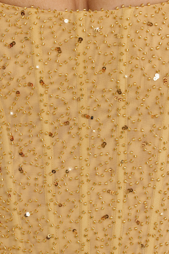 İşlemeli Korse Tül Etek Altın Rengi Mini Elbise