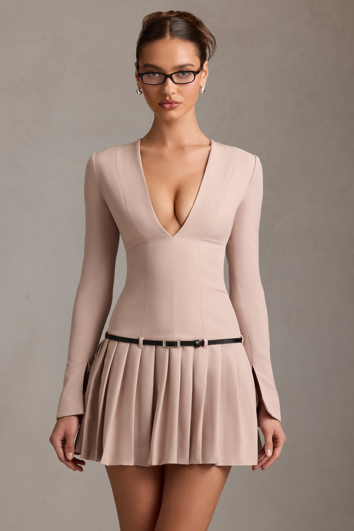 Uzun Kollu Pileli Mantarlı Mini Elbise
