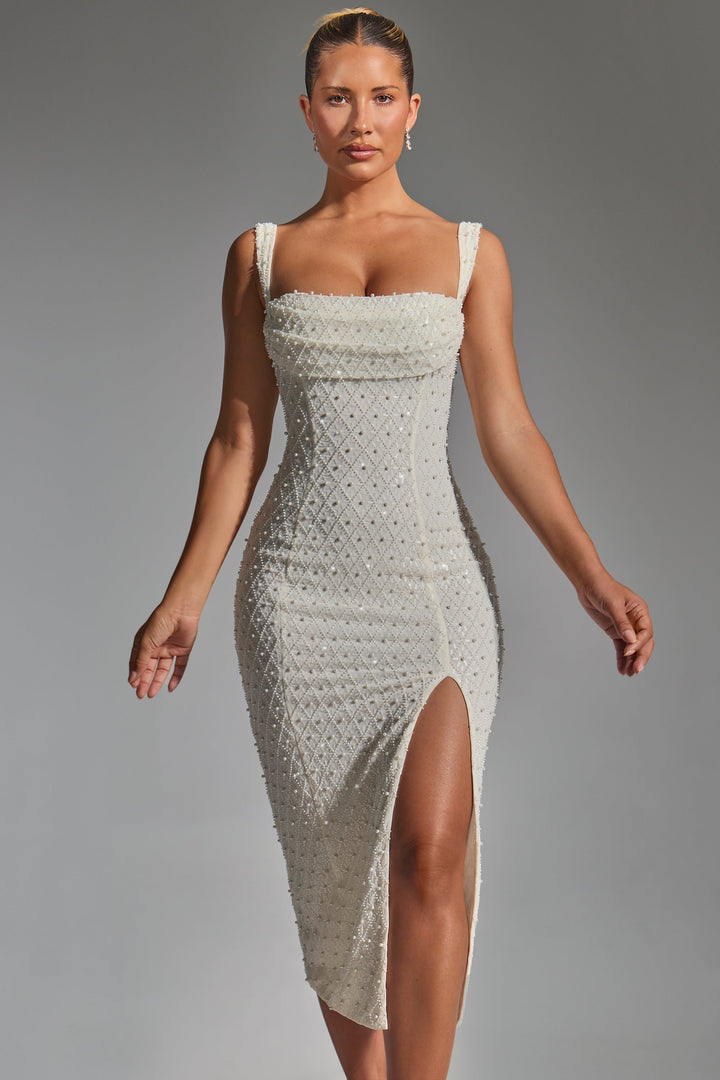 Beyaz İşlemeli Dekolteli Midaksi Elbise