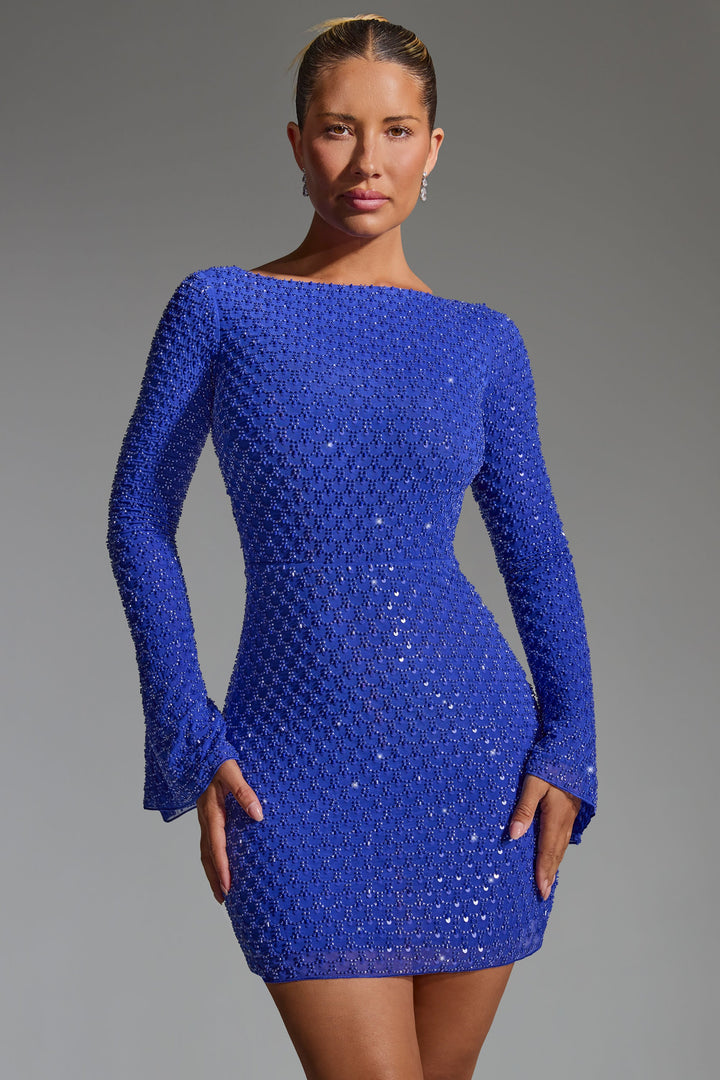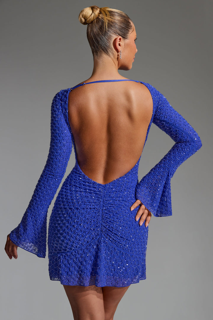 Kobalt Mavisi Taşlı Sırtı Açık A Kesim Mini Elbise