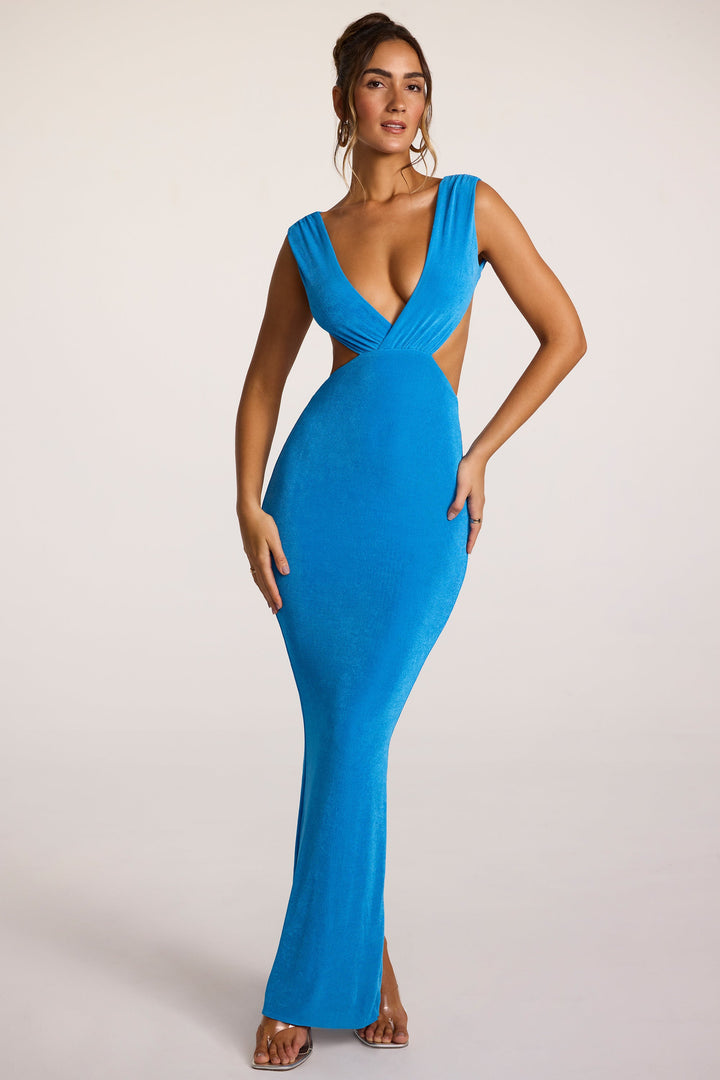 Kobalt Mavisi Dokulu Jarse Dekolteli Uzun Elbise