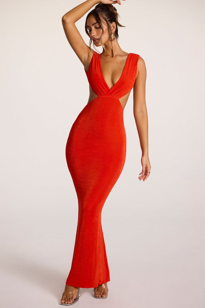 Ateş Kırmızısı Dokulu Jarse Dekolteli Uzun Elbise