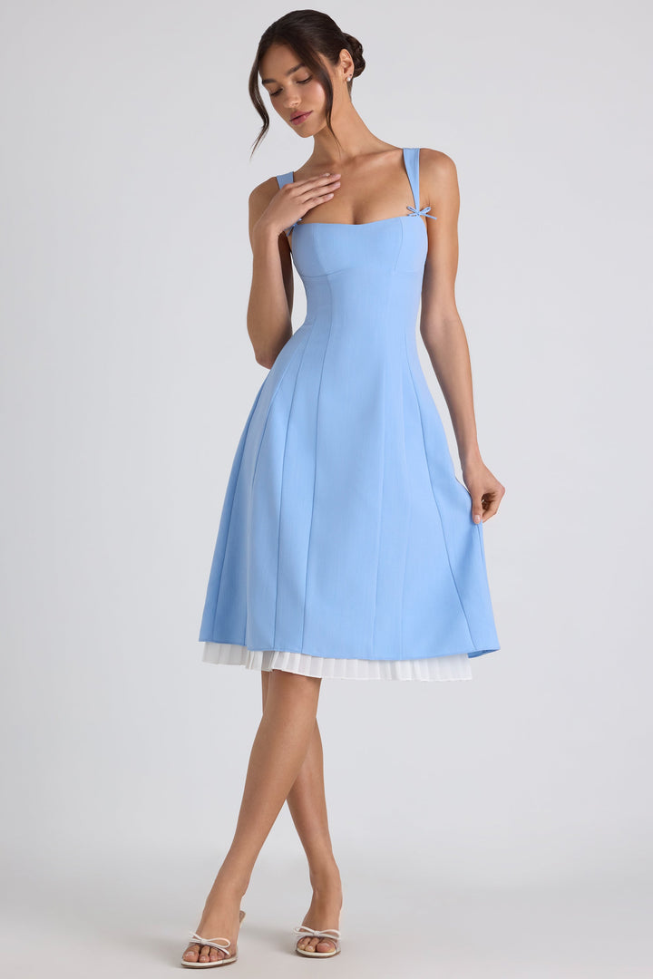 Fiyonk Detaylı Pileli A Kesim Gök Mavisi Midi Elbise