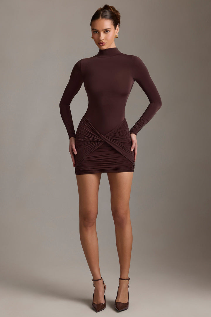 Çikolata Kahvesi Dantelli Sırtı Açık Balıkçı Yaka Mini Elbise