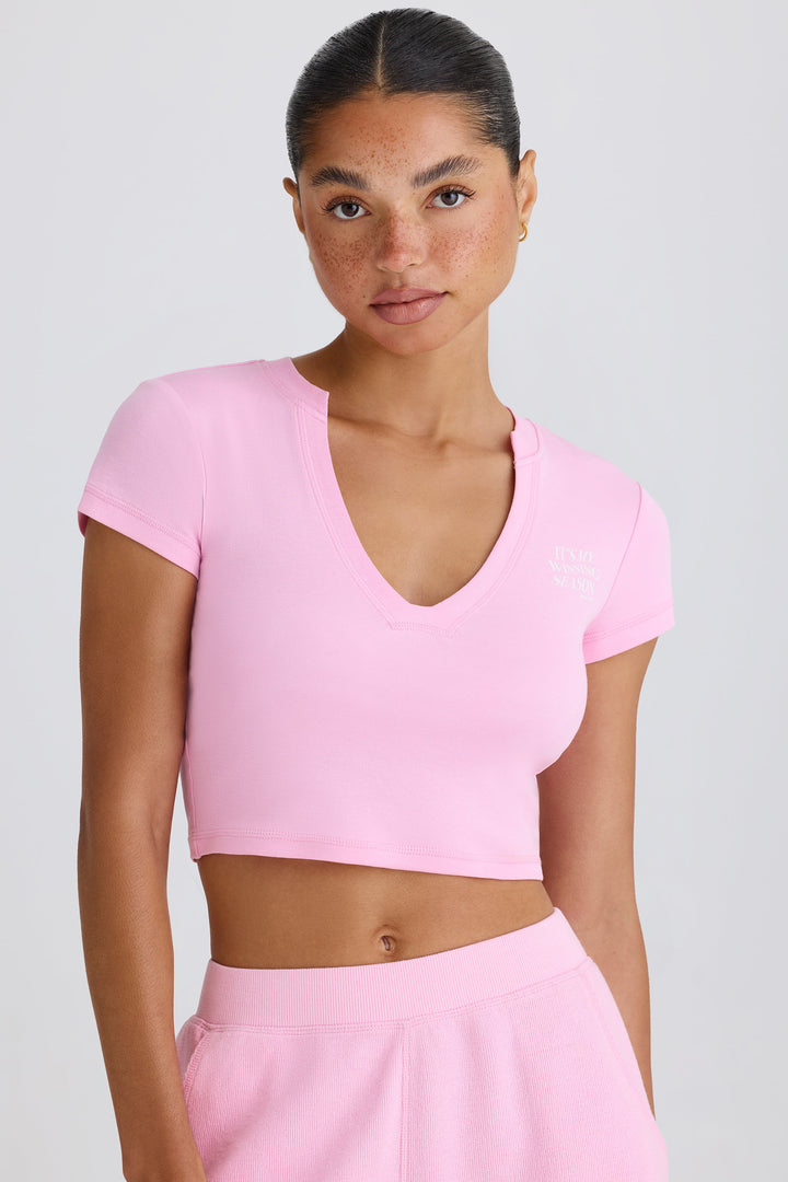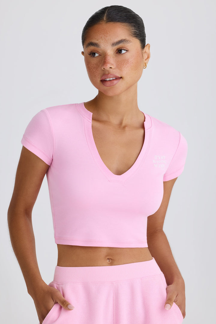 Sakız Pembesi Grafik Desenli Kırpılmış Tişört