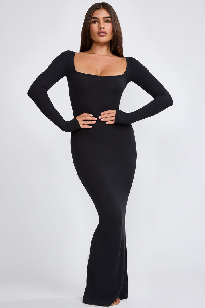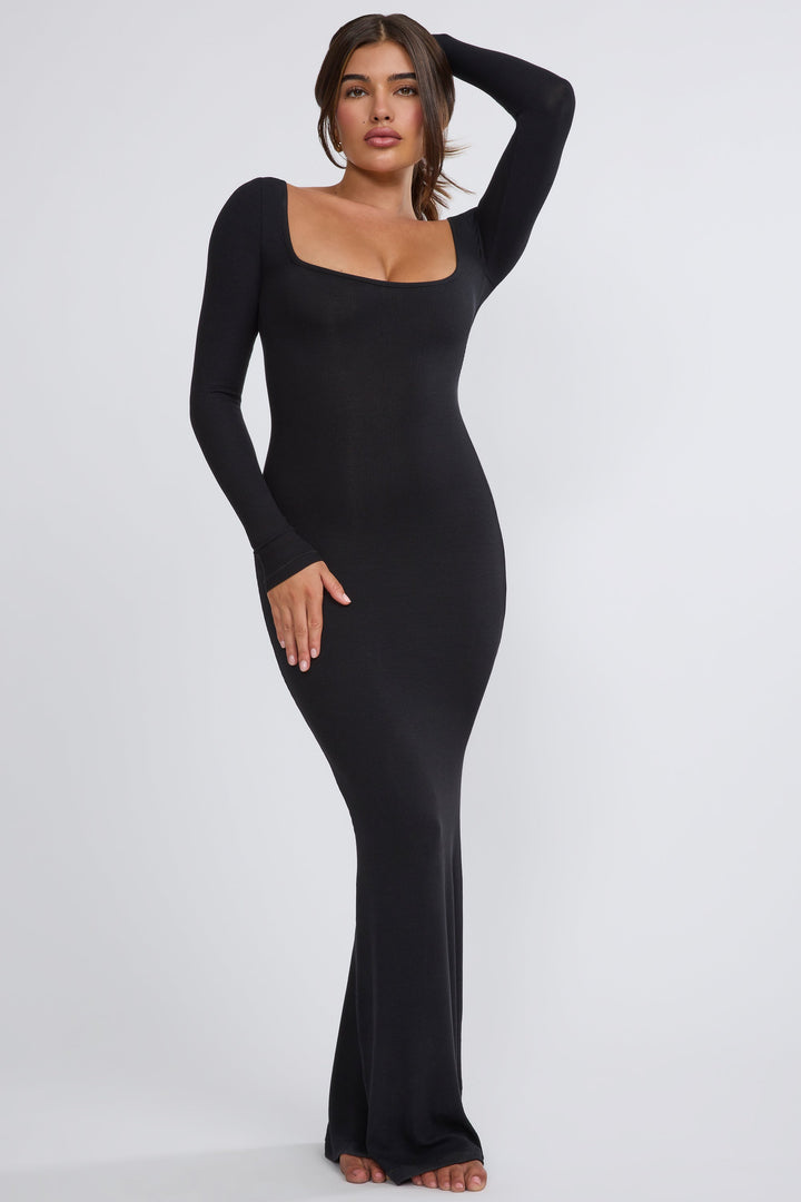 Siyah Fitilli Modal Uzun Kollu Maxi Elbise