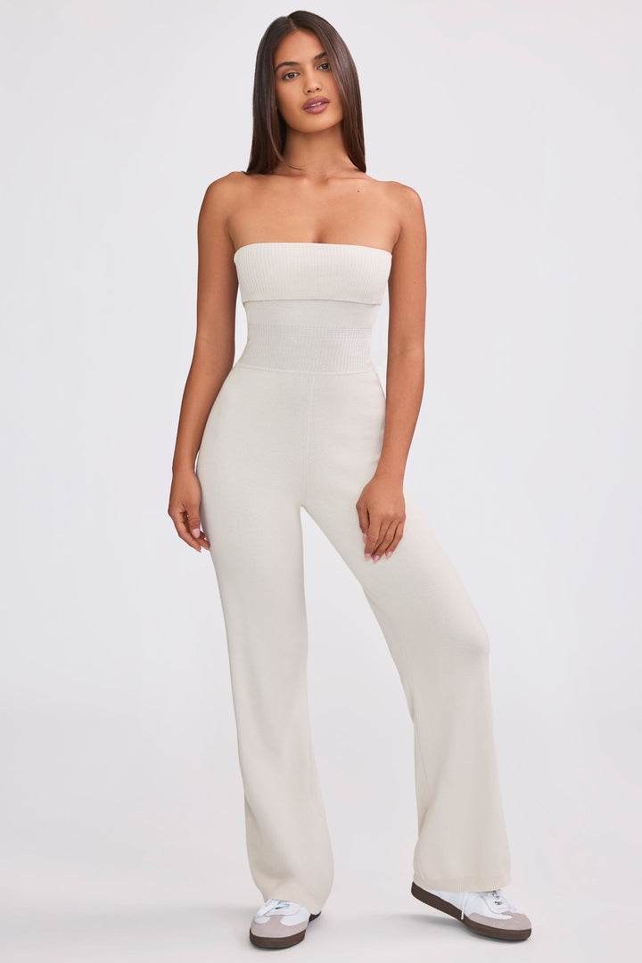 Krem Bandeau Kick Flare Kalın Triko Tulum