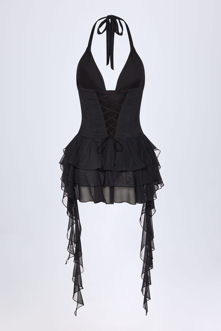 Siyah Fırfırlı Boyundan Bağlı Bodysuit