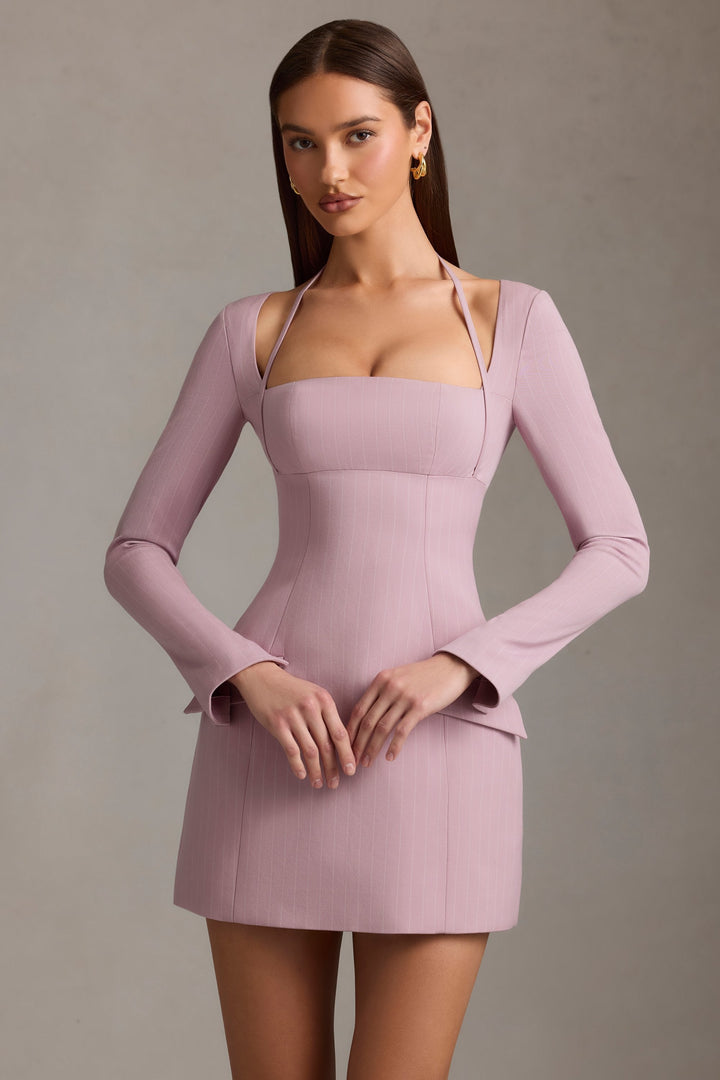 Leylak Rengi İnce Çizgili Desenli A Kesim Mini Elbise