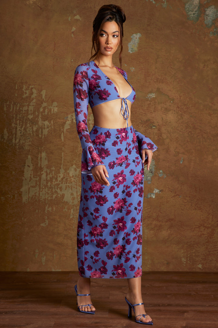 Cezayir Menekşesi Desenli Yandan Yırtmaçlı Midaksi Etek