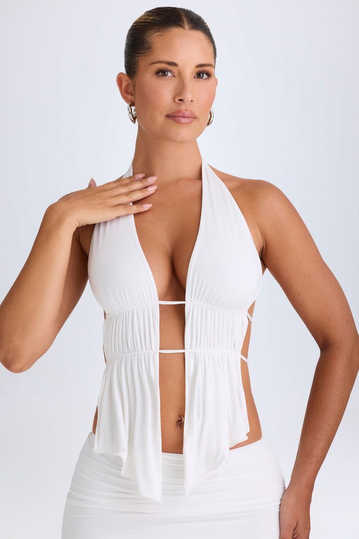 Beyaz Kesikli Dantelli Boyundan Bağlı Crop Top