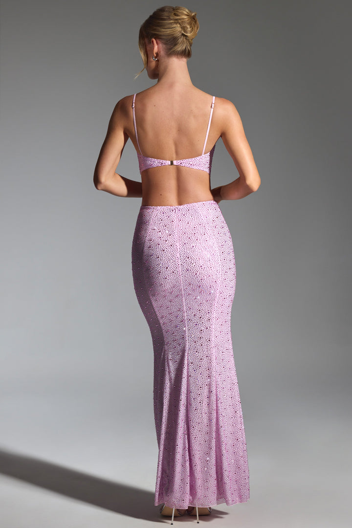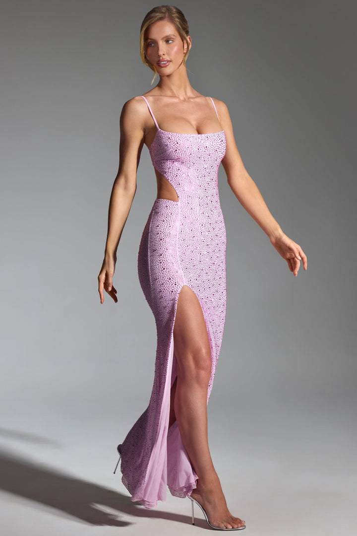 Şakayık Pembesi Taşlı Kesik Balık Kuyruğu Maxi Elbise