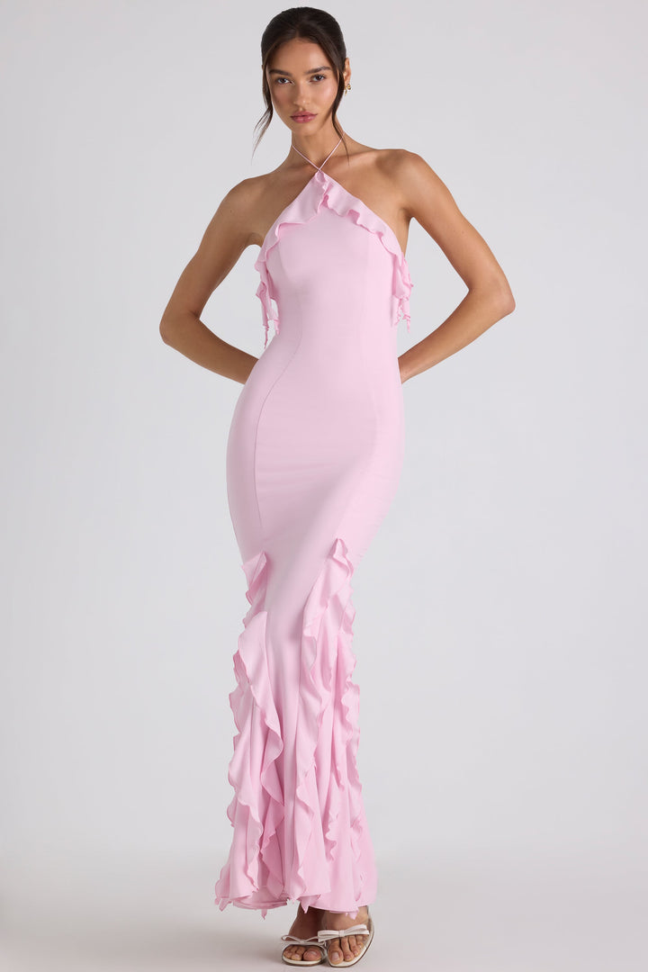 Yumuşak Pembe Fırfırlı Boyundan Bağlamalı Elbise