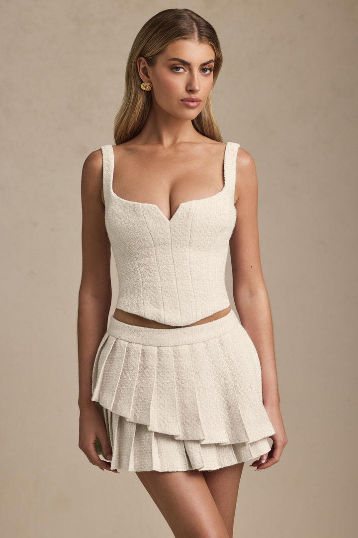 Fildişi Katlı Pileli Düşük Belli Mini Etek