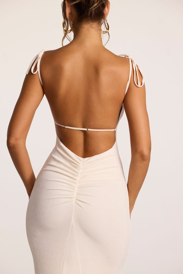Fildişi Dokulu Jarse Sırtı Açık Uzun Elbise