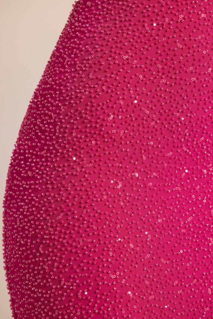 Fuşya Taşlı Kesik Uzun Elbise