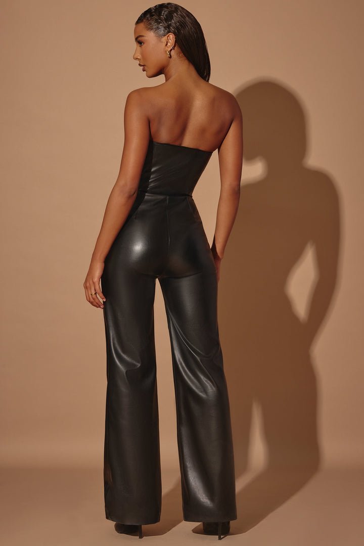Siyah Straplez Geniş Paça Vegan Deri Tulum