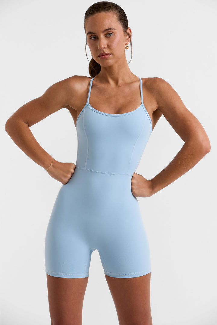 Yuvarlak Yaka Sırtı Açık Unitard Buz Mavisi