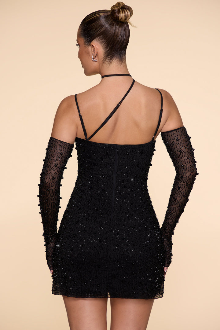 Siyah İşlemeli Asimetrik Korse Mini Elbise