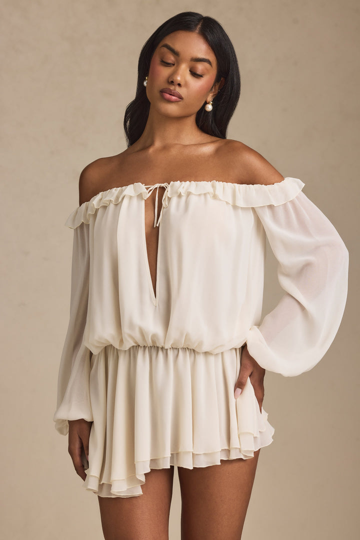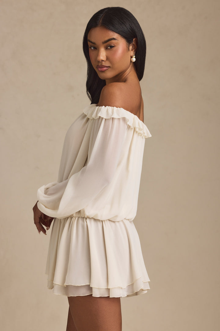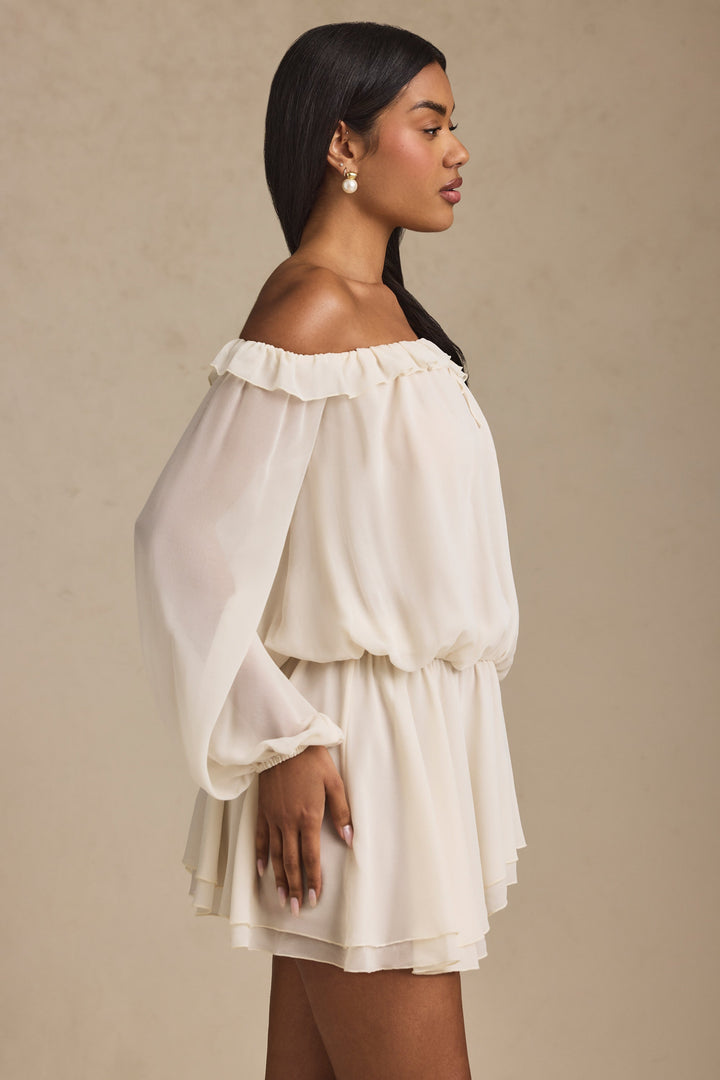 Fildişi Omuzları Açık Asimetrik Balon Kol Mini Elbise