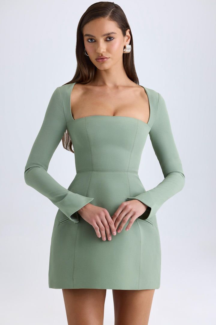 Haki Yeşil Kare Yaka Yapılı Lale Mini Elbise