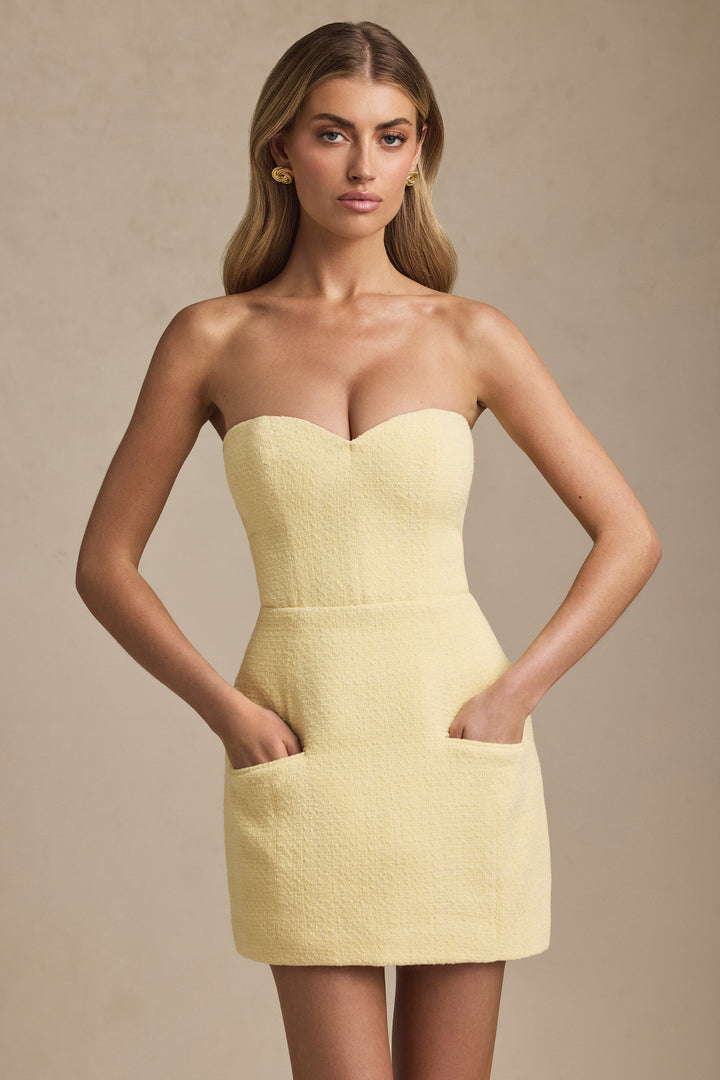 Pastel Sarı Kalp Yaka Straplez Yapılı Mini Elbise