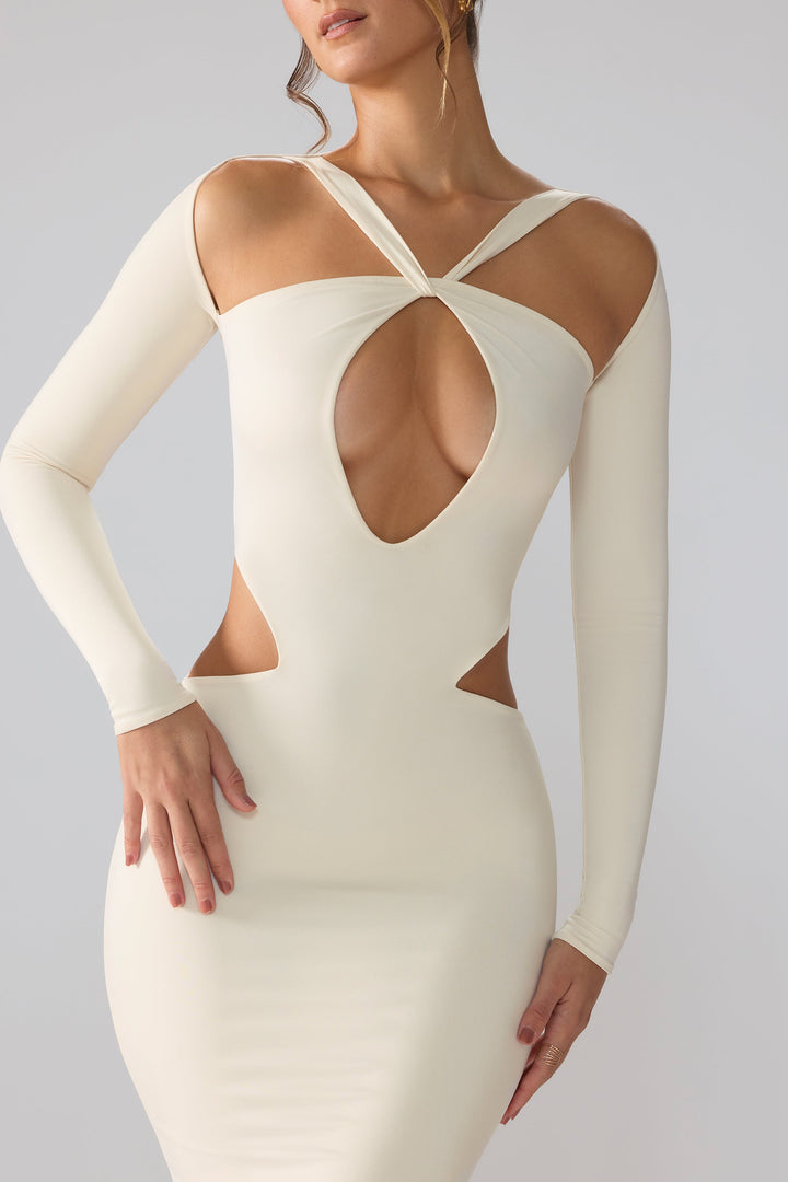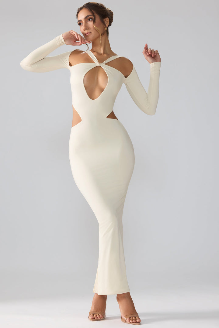 Premium Jersey Uzun Kollu Fildişi Kesimli Maxi Elbise