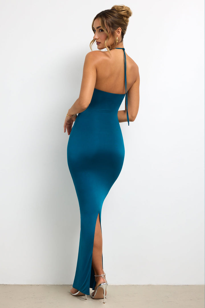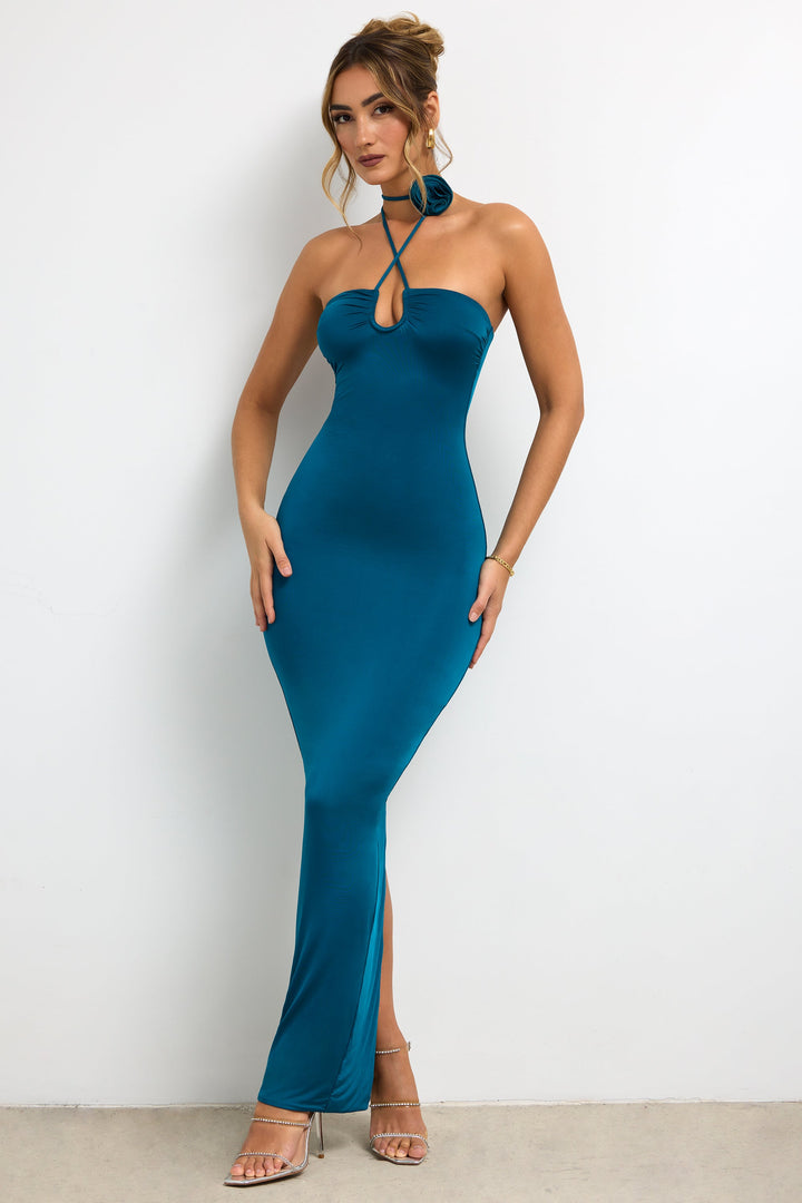 Slinky Jersey Gül Detaylı Boyundan Bağlamalı Koyu Teal Uzun Elbise